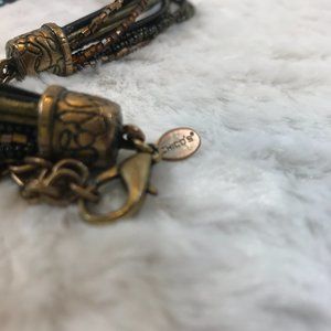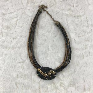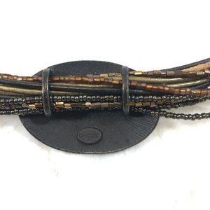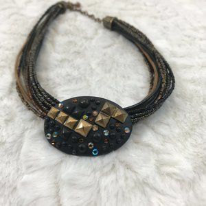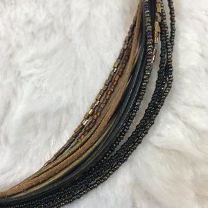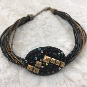 Multi strands Leather and seed bead holds a black slide oval pendant with multi color stones & gold cones stones.