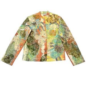 This stunning Chico’s lightweight shacket features a vibrant, multi-media design combining intricate lace, embroidery, chiffon, and tweed textures.