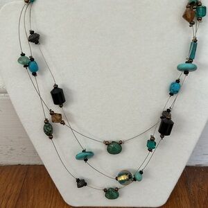 Three thin wire strands with turquoise blue, green, gold and brown bead stations, lobster claw clasp and 3” extender. About 18” long. Pet and smokefree home, fast shipping!