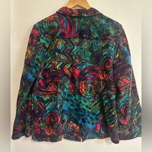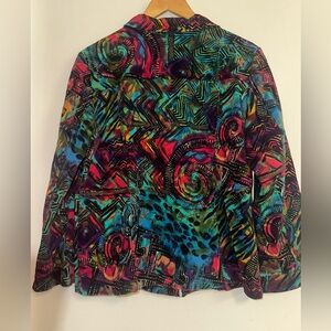 Eye-catching jacket with a dynamic abstract design. Features a blend of purple, blue, and black hues.