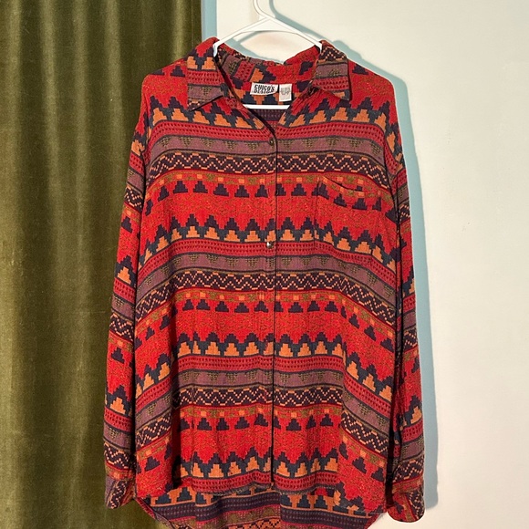Get cozy this fall and winter in this vintage Chico’s Design Aztec patterned button-up shirt with the softest material. Features a mix of red, orange, and blue hues. Ideal for a standout style. Dress up or down with your favorite boots.