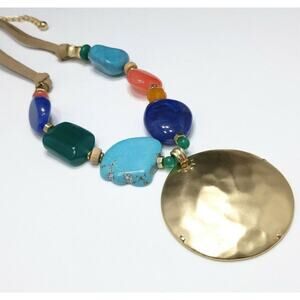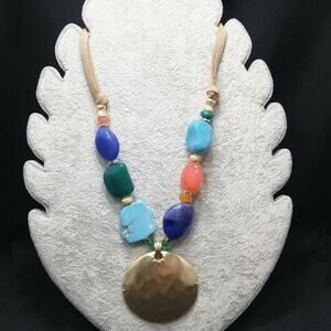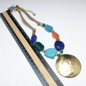 This is a new Chico’s multicolor gemstone-style statement necklace featuring large faux and genuine stone beads in bold shades of turquoise blue, coral, green, and royal blue. The necklace is accented with a brushed gold tone hammered pendant suspended from a double suede cord, creating a sophisticated yet bohemian style.