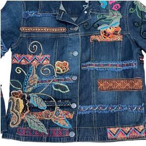 Vibrant and full of personality, this Chico’s denim jacket features intricate multicolor floral embroidery and ribbon detailing that bring texture and charm to a classic silhouette. The design showcases a traditional button-up front, collared neckline, and front pockets, all elevated by the unique embroidered accents across the chest, sleeves & back. Designed in Chico’s size 0 (fits like a US small), A statement layering piece perfect for spring, early fall, or cool summer nights. Dress it up with a skirt or pair it with jeans for an artsy, boho-chic vibe. A standout piece for lovers of eclectic, feminine fashion.