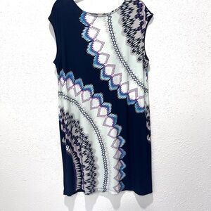 PREOWNED Vibrant shift DRESS with geometric design. Features purple, blue, and white patterns. Perfect for a bold look.