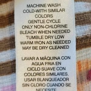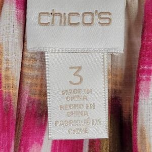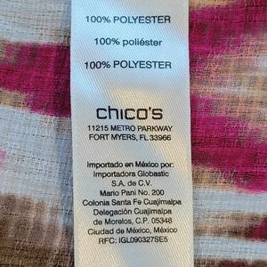 Vibrant ikat print tunic. Features a mix of pink, orange, and brown. Flowy and stylish design.