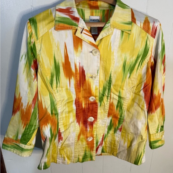 multi-color tropical or watercolor print cotton jacket featuring a collared button-front design. Yellow, green, and orange hues. Ideal for a vibrant look.