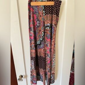 Chico's pants with intricate patterns. Features orange, black, and cream tones.