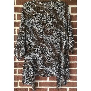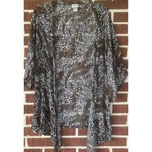 Add some excitement to your wardrobe with this Chico's multicolored lightweight cardigan. Perfect for travel, casual outings, workwear, or business settings, this open-knit sweater features short sleeves and a casual neckline. The animal print pattern and colorful theme make it a fun addition to your collection.