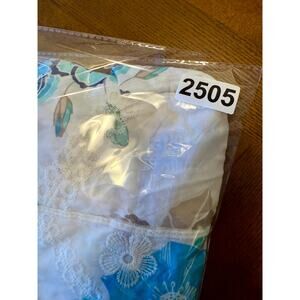 Color: White with blue/teal floral print