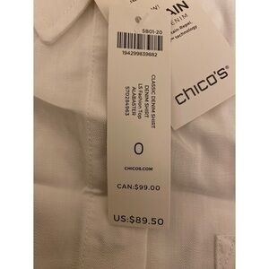 Chico’s NO-STAIN WHITE CLASSIC DENIM SHIRT Sz 0. This classic, white denim shirt, With long sleeves, and chest pockets, and button closure. This is a beautiful top.! Length: 27.5". Condition is "New with tags". Final sale