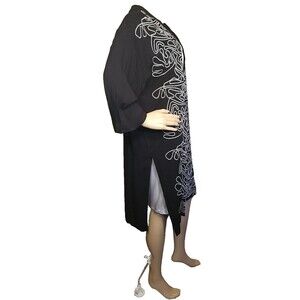 Add a touch of elegance to your wardrobe with this beautiful black kimono jacket from Chico's. The jacket features intricate French knot embroidery that adds a unique touch to the overall design. Made from high-quality rayon fabric, this jacket is comfortable to wear and perfect for any occasion. The jacket is available in size S/M and is suitable for regular size types. The jacket is ideal for women and can be paired with any outfit to create a stylish look. Retail $149, New with tags.