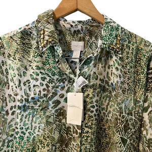 Chicos NWT Green Leopard Print Abstract Button Up Blouse Rhinestone Bling Collar