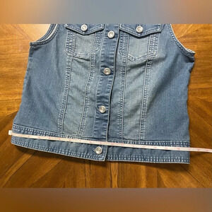 This is a listing for a preowned Chicos NWT Scattered Stones Denim Vest Bling Size 0 Small. The condition is excellent, like new, tags and extra gems attached. Please see all photos for details as they are part of the description.