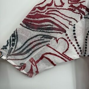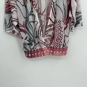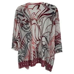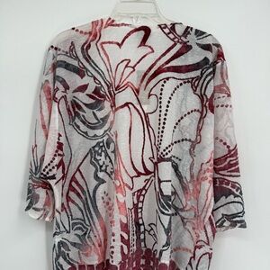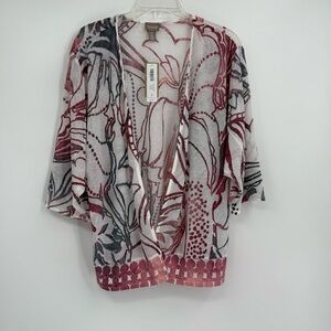 Chico’s NWT Tie-dye Look Jacquard Sheer Jacket Size 2(L) Open Front 3/4 Sleeves. Polyester rayon. Abstract gray red pattern on ivory background. Semi sheer. Bust 54. Length 28. Dolman. Measurements are approximate. Lightweight. New.