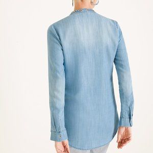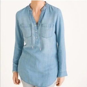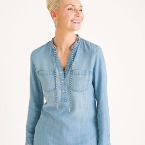 Seas the day in this denim top—its rope detail delivers a nautical-chic vibe. Perfect with white pants, stripes or denim, it offers a relaxed fit with chest pockets and long sleeves, plus hardware details for a touch of polish.