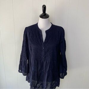 Chico's Navy Blue Eyelet Scallop Hem Pleated Popover Blouse Size 3 US 16
