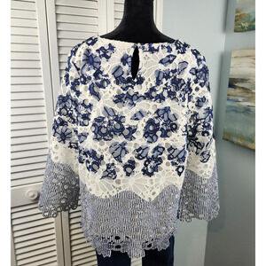Chico’s Navy White Lace Blouse Size Large Bell Sleeve Lined Crochet Holiday Work