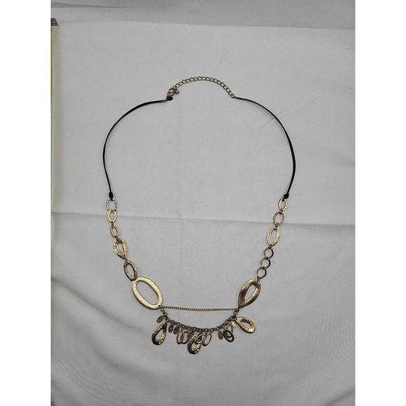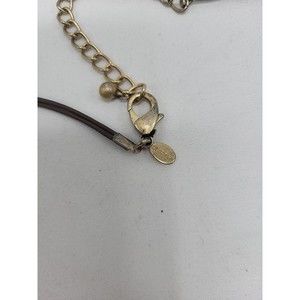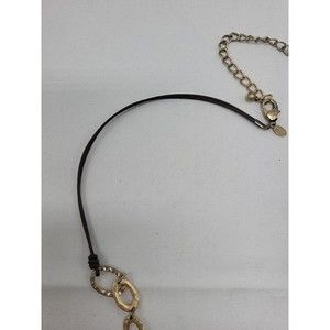 Nice previously worn Chico's long gold, leather and sparkle statement necklace. The gold tone ovals have a hammered look and some have rhinestones. There is a leather portion that attaches to the adjustable lobster claw clasp. No damage just some signs of wear at the clasp.