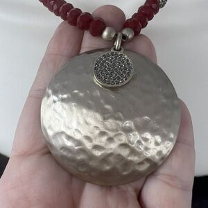 Chico's Necklace Red Beaded Pendant Chunky Adjustable Rhinestone Brass Antiqued