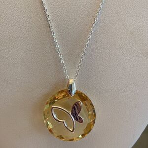 Delicate necklace silver color with yellow crystal with a silver butterfly design on to it