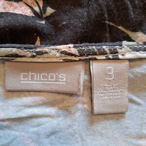 Cute, neutral toned top from Chico's Primarily shades of tan and brown, with pops of peachy pink. V neckline with a twist detail and 3/4 length sleeves. Chico's size 3 is equal to an XL or 16, according to the website. This piece measures about 21 inches between the pits, 27 inches long and 18 inch sleeves. Soft and stretchy.