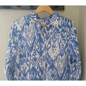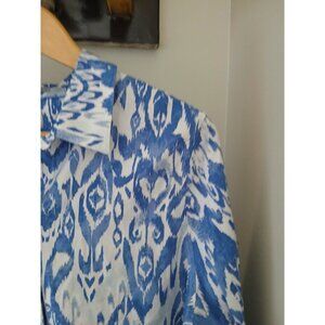 Chico's No Iron Chic Stretch Button Down Blouse. Size 2/12 14. White with a blue Ikat pattern. Wider sleeves. Lagenlook, travel, resort, beach, work. In nice, preowned condition. Measures approximately 21" pit to pit, 25" shoulder to hem.