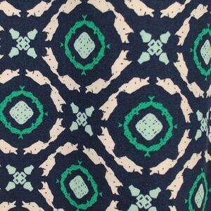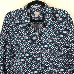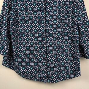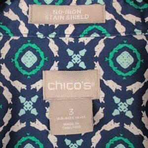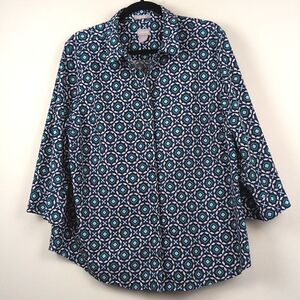 Chico's No Iron Cotton Square-Print Stain Shield 3/4 Length Sleeve Blouse Top in blue, green and white. This shirt features a collar, hidden button front, rounded hem, and a flattering fit. 100% cotton.