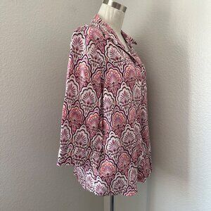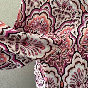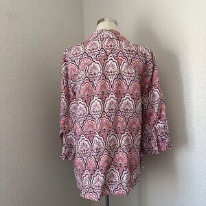 Elegant and versatile, this Chico's blouse features a no-iron linen fabric, perfect for casual outings. With a 3/4 sleeve design and a chic pink paisley pattern, it’s lightweight and breathable for all-day comfort.