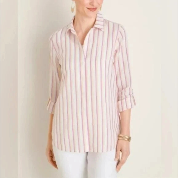 Chico's no-iron striped linen metallic button front shirt in women's size 3, equivalent to a size XL/16-18. Wrinkle resistant. Long roll tab sleeves have button cuffs. Multi-colored lurex stripes for a hint a shimmer. One button on roll tab sleeve was replaced - see photo.