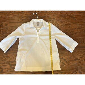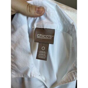 Item: Chico's Womens Size 0 White No Iron Shirt with 3/4 Sleeves. Features two pockets and a collar.