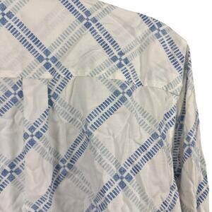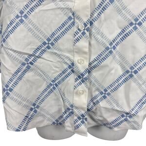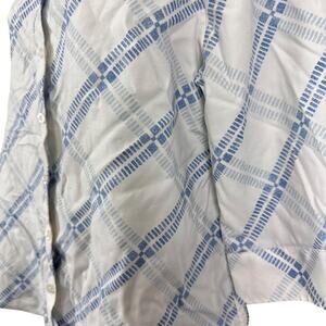 The Chicos No Iron Stretch Button Up 3/4 Sleeve Cotton Blue White Shirt in size 12P is a versatile and stylish top suitable for various occasions such as travel, casual outings, and business meetings. Made from a comfortable cotton blend fabric with added stretch and wrinkle-resistant features, this collared shirt in a blue plaid pattern adds a touch of sophistication to your wardrobe. With its wide straps and casual sleeve length, this Chico's shirt is perfect for the summer, fall, and spring seasons, making it a must-have for any fashion-forward woman in sizes 12P to 14.