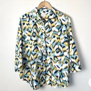Chico's No-Iron Colorful Ikat Print Linen Long Sleeve Button-Down Shirt Sz 4/20