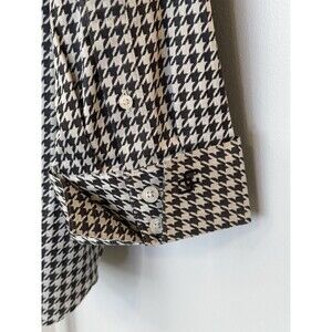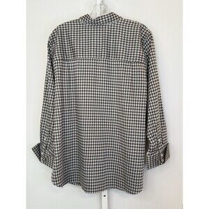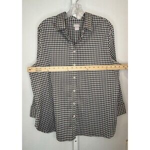 Classic and versatile Chicos women's button-down shirt featuring a black and white houndstooth pattern. Made with No-Iron Coolmax All-Seasons Stretch fabric, this top is designed to stay wrinkle-free and comfortable year-round. The cotton blend offers breathability with added stretch for ease of movement.