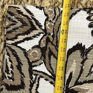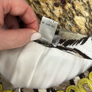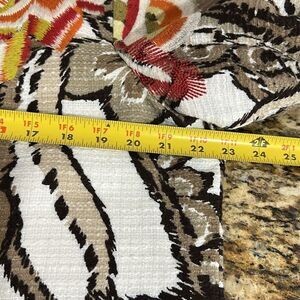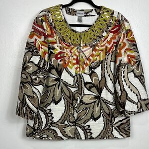 This jacket features a bold, artistic design with a mix of large, abstract floral and leaf patterns in earthy tones like brown, beige, and black, contrasted with vibrant pops of mustard yellow, red, and white. The neckline is a standout detail, adorned with a unique, decorative yellow embellishment that adds a touch of bohemian flair. The fabric has a textured look. Jacket has a hook and eye closure with three-quarter-length sleeves. The overall style is eclectic and eye-catching, perfect for making a statement Shell: cotton Lining: poly Excellent pre-owned condition Smoke free home Pit to pit is approximately 23” 00752a