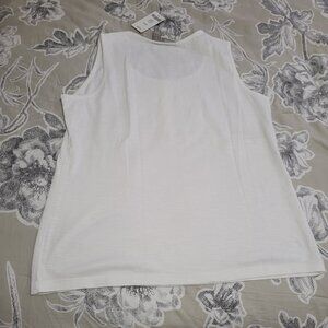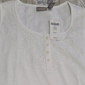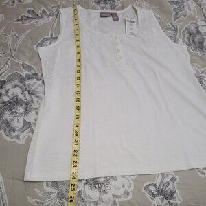 Chico's Off White Cotton Sleeveless Tank w/ Embroidery & Button Detail. Size Medium Henley style with embroidery. around the neckline. Delicate with good coverage. Chico's Size 1 = Medium. The color is more of an eggshell, not bright white. (The photos showed my shadow & it was difficult to get the lighting right.) .Top is in perfect condition. Brand new with tags.