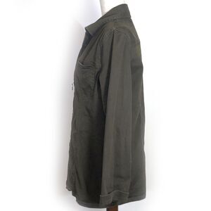 This lightweight, unlined Chico's jacket in dark olive green features a full zip front and breast pockets, crafted from a stretch denim-like cotton/spandex blend. Pre-owned and in very good condition.