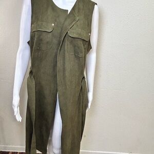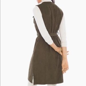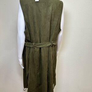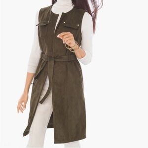 Stylish olive vest by Chico's. Features a belted waist and sleek design. Ideal for layering.