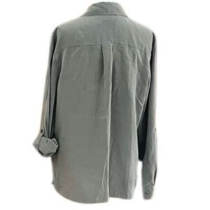Stylish olive button front shirt with front button pockets. Tab sleeves, cuffs with buttons. Shirttail hem. 87% Modal, 13% polyester. Feels like silk. Perfect for casual wear.