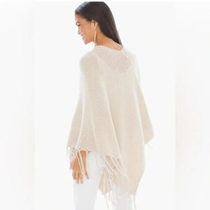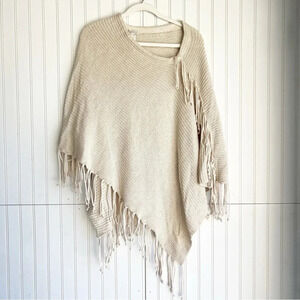 Cozy ribbing and soft silhouettes— oh, how we've missed you. This chic fringed poncho is everything a cold weather wardrobe could want, all in a beautiful metallic knit fabric.