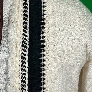 Beautiful textured weave unlined jacket by Chico's. Features a decorative cream and black accent around the collar with a short brush fringe around neck, cuffs and hem. Perfect for layering as its unlined. Soft like a sweater and with a sweaters stretch. Measurements: Chest: 19" Length: 31" Sleeve: 30" No stains, tears, unraveling or other issues. See photos for condition details. Non smoking home. Features: • Jacket Size: Womens 4/6 Condition: Pre-Owned Good