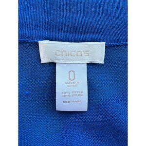 This Chico's open-front cardigan in a striking royal blue is crafted from a lightweight rayon and nylon blend. The semi-sheer knit design adds a breezy, stylish touch.