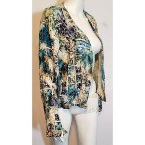 The jacket is a size 2 in Chico's or a large and has a short length with an open front closure. It's a basic jacket with unique features, including a colorful theme, making it perfect for any season, including winter, summer, fall, and spring. This jacket is a must-have for any fashion-conscious woman who wants to stand out and make a statement.