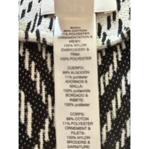 This Chico’s open-front jacket features a black-and-white zigzag patterned base with vibrant, textured floral embroidery in rich tones of coral, red, pink, and bronze. Trimmed in a bright coral orange, the contrast and craftsmanship make this the perfect lightweight statement layer for spring or fall.