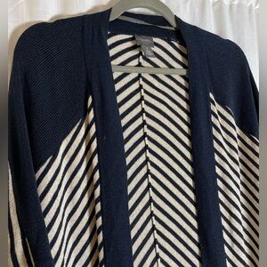 Gorgeous open sweater shawl in black and gold stripes metallic with pockets by Chicos Traveller's Collection. Heavy, weighted piece. Amazing quality.