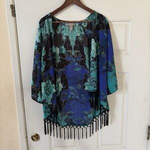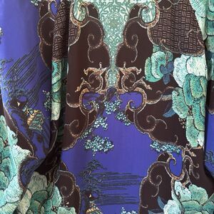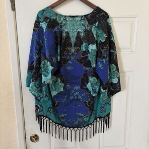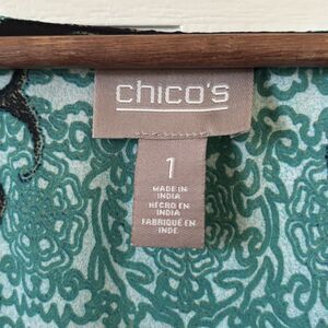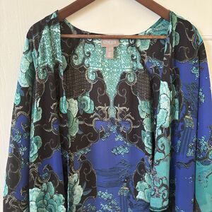 Chicos Open Wrap Top Asian Inspired Art to Wear SZ 1 Boho Blue Colorful Glam 90s