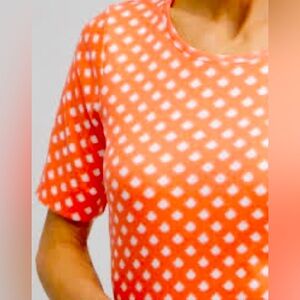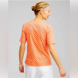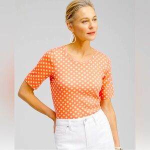 Elevate your style with this vibrant orange short sleeve tee from Chico's, featuring a fitted design that flatters your silhouette. Crafted for comfort and style, this top is perfect for warm weather outings. Its chic and modern look makes it a versatile addition to any wardrobe.( pit2pit 23” length 26” approximately)