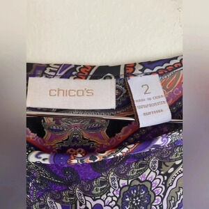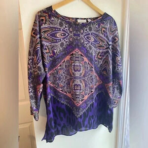 Chicos Paisley Leopard Print Blouse Purple Pink 3/4 Sleeve Boat Neck Size Large