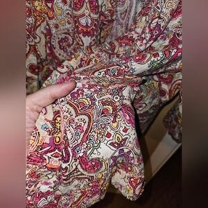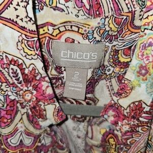 This is for a Chicos open front jacket. This has a pink paisley print. Has 2 pockets on the front. Ruffle around the bottom. This is a size 2.