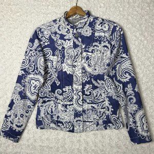 Chico's Paisley Print Denim Jacket Button Front Long Sleeve Blue White Size 0