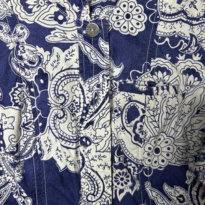Keywords: Chico's jacket, paisley denim jacket, blue and white jacket, button front jacket, long sleeve jacket, women's denim jacket, bohemian jacket, casual jacket, printed denim jacket, size 2 jacket, ladies jacket, outerwear, fashion jacket
